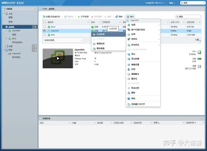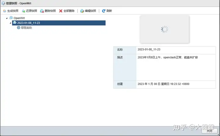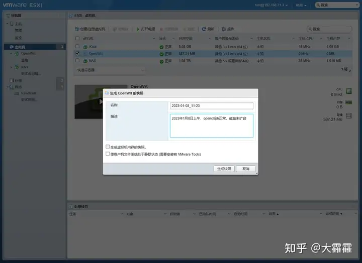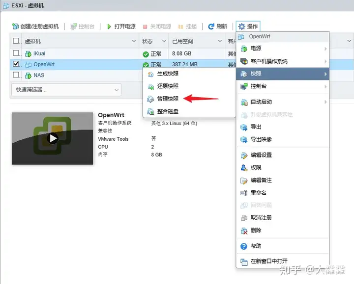 折腾之前最好把虚拟机做个快照,省的搞砸了还得重新安装OpenWrt。先关机,调整硬盘空间,然后做快照