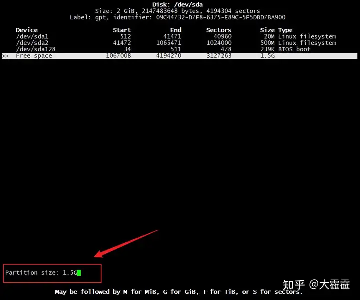 Disk /dev/sda: 2 GiB, 2147483648 bytes, 4194304 sectors