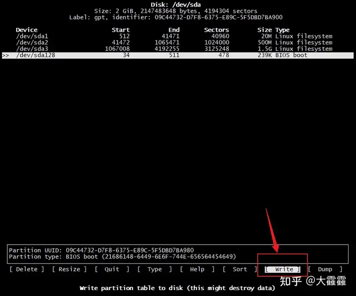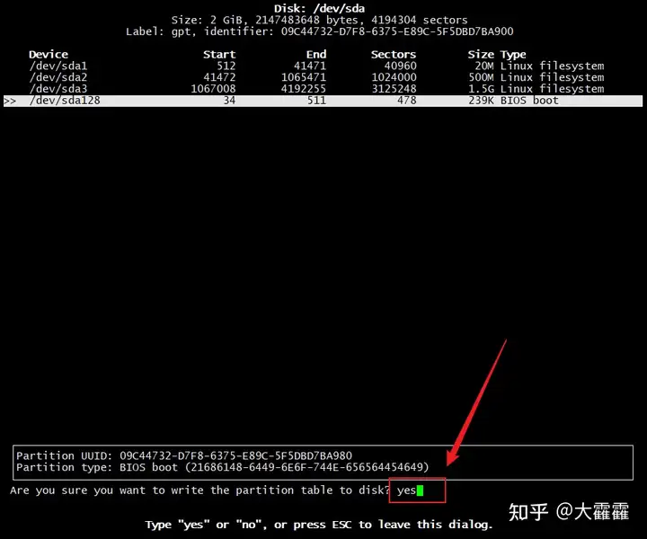“Write”写入分区,然后输入“yes”回车,“Quit”退出