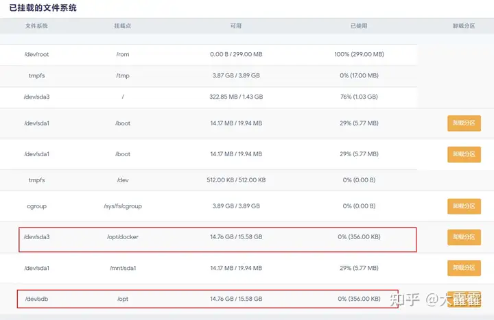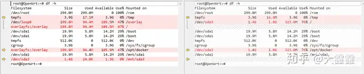 一般大佬们的固件都不会给我们留下太大的空闲磁盘空间,不利于我们瞎搞,但Docker吃硬件,内存增加很简单,磁盘空间不足要增加会稍微麻烦一些。查看剩余空间: