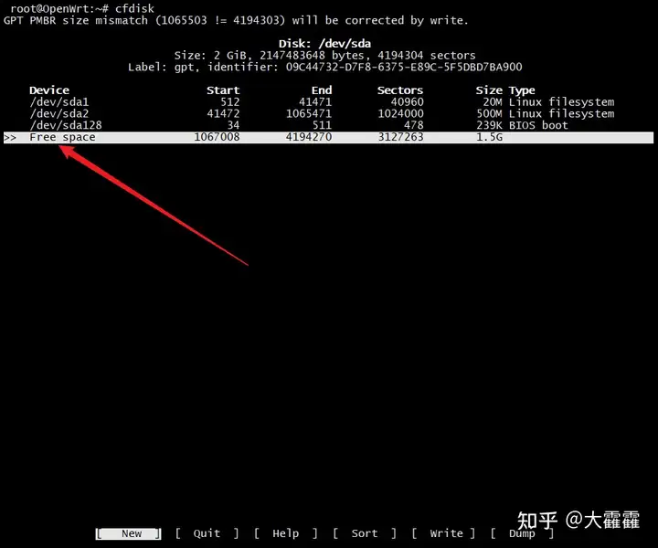 光标移动到“Free space”,选中空闲空间,然后选择下面的“New”新建分区,回车
